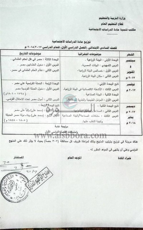 ننشر توزيع منهج الدراسات الاجتماعية للصف السادس الابتدائى للعام الدارسى 2018/2017