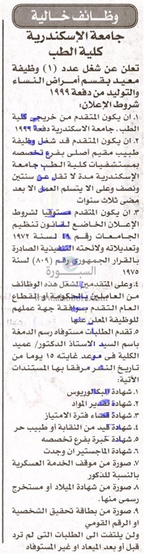 تعلن عدد من الكليات جديدة بجامعة الإسكندرية عن وظائف لأعضاء هيئة التدريس "من حملة الماجستير والدكتوراه " وذلك وفقا لنص الإعلان التالي:-
