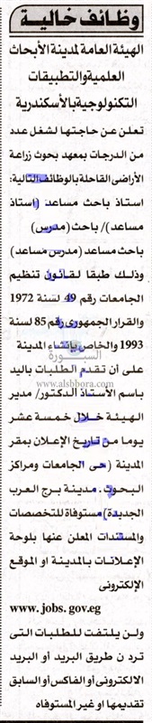 تعلن مدينة الأبحاث العلمية عن وظائف جديدة لأعضاء هيئة التدريس "من حملة الماجستير والدكتوارة" وذلك وفقا لنص الإعلان التالي:-