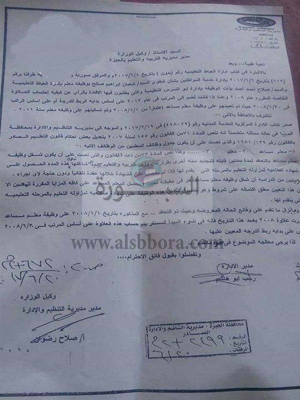 أرسلت مديرية التنظيم والإدارة بالجيزة، إلي مديرية التربية والتعليم خطاباً، تشير فيه إلي كتابي إدارة العياط وأبو النمرس "أنه تنص المادة 71 من القانون رقم 155 لسنة 2007، بتعديل بعض أحكام قانون التعليم الصادر بالقانون رقم 139 لسنة 1981 والذي نص علي أن يكون جدول وظائف المعلمين يبدأ من معلم مساعد، وكذا نص المادة 73 من ذات القانون ، والتي تشترط حصول المعلم المساعد علي شهادة الصلاحية، ويتبين من الدراسة، أن شغل وظيفة معلم مساعد هي في حقيقتها تعيين ولكن يشترط الحصول علي شهادة الصلاحية، وفي ضوء ما تقدم من وقائع معروضة، فأنه وفقأ للمبدأ المستقر يتم حساب هذه العلاوة علي أساسي المرتب في 30/6/2008 علي أساسي المرتب وليس علي بداية ربط الدرجة المعين عليها".