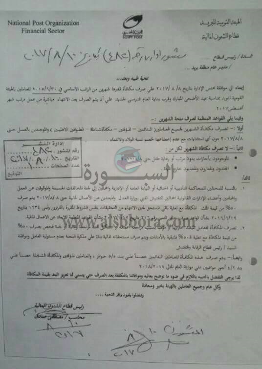 أعلنت الهيئة القومية للبريد عن صرف مكافأة شهرين على الراتب الأساسى2015/6/30، بمناسبة عيد الأضحى المبارك وقرب بداية العام الدراسى الجديد 2018/2017، على أن يتم الصرف بعد الانتهاء من عمل رواتب شهر أغسطس الجارى، وجاء نص القرار كالتالى: