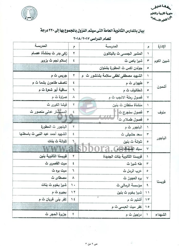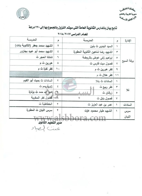 إعتمد الدكتور هشام عبد الباسط محافظ المنوفية كشف بالمدارس الثانوية و التي تسمح كثافتها بقبول طلاب جدد للعام الدراسي 2017 / 2018 حيث قرر النزول بمجموع القبول إلي 220 درجة بتلك المدارس تيسيراً علي أولياء الأمور وحفاظاً علي مستقبل أبنائهم الطلاب .