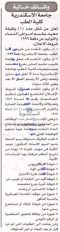 تعلن جامعة الإسكندرية عن وظائف جديدة لأعضاء هيئة التدريس وأخر موعد للتقديم 23 أغسطس وذلك وفقا لنص الإعلان التالي:-