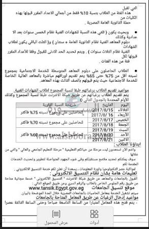 ننشر موعد وشروط التقديم لطلاب الشهادات الفنية بتنسيق القبول بالجامعات