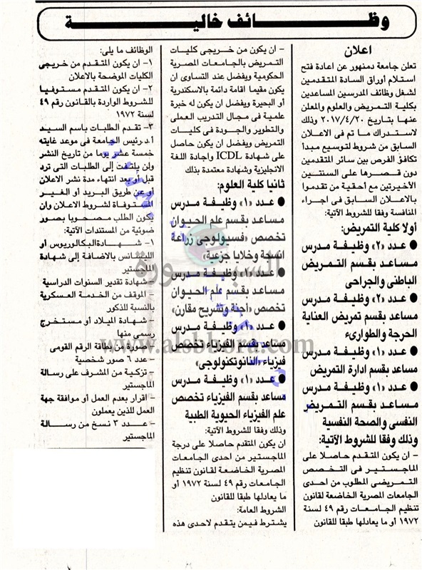 تعلن جامعة دمنهور عن وظائف جديدة لأعضاء هيئة التدريس بعدد من الكليات وذلك وفقا لنص الإعلان التالي: