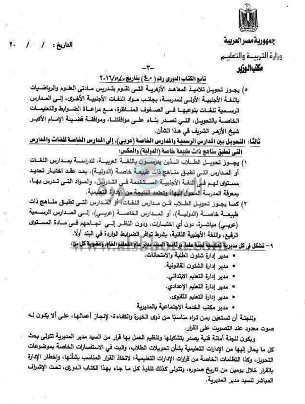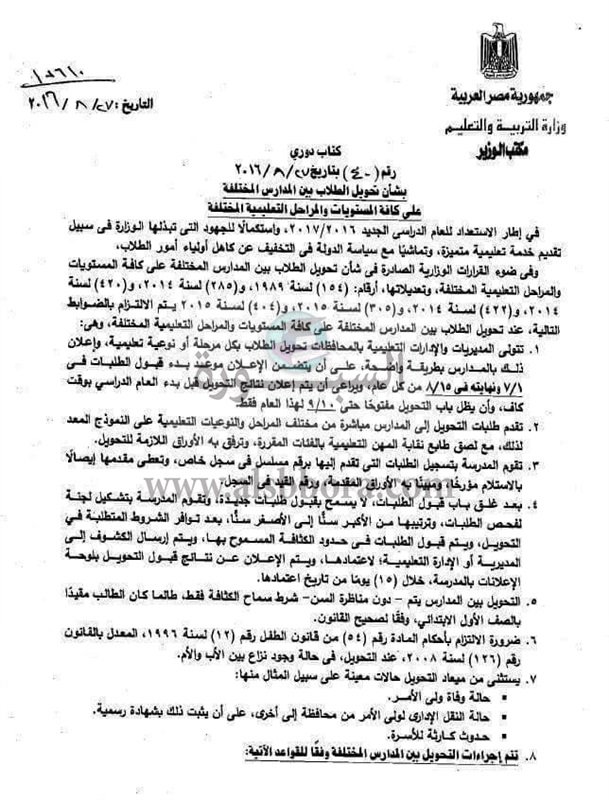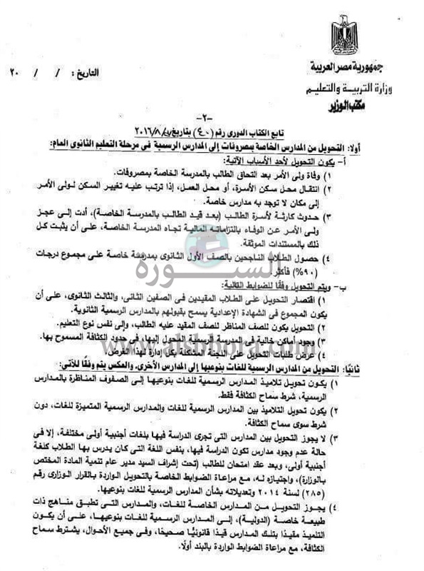أصدرت وزارة التربية والتعليم والتعليم الفنى كتابا دوريا رقم 40 بشأن التحويلات بين المدارس ومن الازهر للعام.