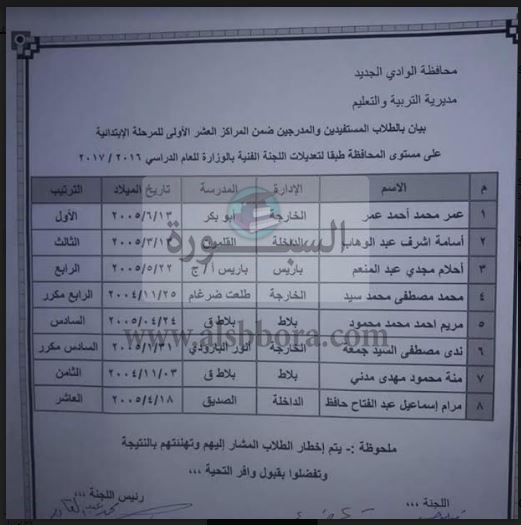 محافظ الوادي الجديد يعتمد اعمال اللجنة المكلفة بمراجعة أوائل الشهادتين الابتدائية والإعدادية