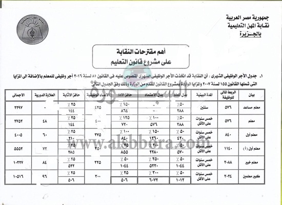 وكان نقيب المعلمين، طالب المهندس شريف اسماعيل رئيس الوزراء، بضرورة تطبيق جدول أجور المعلمين المعد من قبل النقابة، مشيرا إلى أن المهندس شرف إسماعيل، أكد صعوبة تطبيقه خلال عام واحد فقط، وإنما تستطيع الدولة تطبيقه بالتدريج على عدة سنوات مراعاة للظروف الاقتصادية التي تمر بها البلاد.