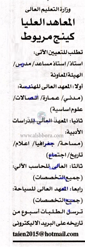 تعلن "معاهد كينج مريوط" عن وظائف جديدة لأعضاء هيئة التدريس "من حملة الماجستير والدكتوراه" وذلك وفقا لنص الإعلان التالي