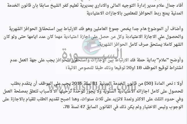 تنشر "السبورة" رأي التوجيه المالي والإداري والذي ينص علي أن الإجازات الاعتيادية لا تحرم المعلم من الحوافز وعدم اشتراط التوقيع 18 أو 20 يوما