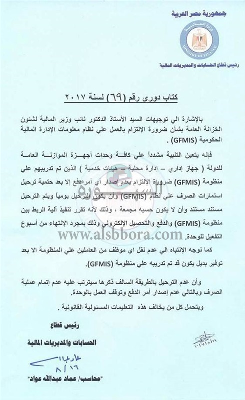 أصدرت وزارة المالية كتابا دوريا رقم 69 لسنة 2017 بشأن ضرورة الإلتزام بالعمل على نظام معلومات الإدارة المالية الحكومية (GFMIS).