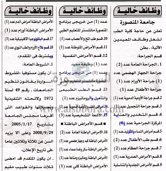 تعلن جامعة المنصورة عن وظائف جديدة لأعضاء هيئة التدريس "من حملة الماجستير والدكتوراه" في 18 تخصص وذلك علا بأن أخر موعد للتقديم وذلك وفقا لنص الإعلان التالي: