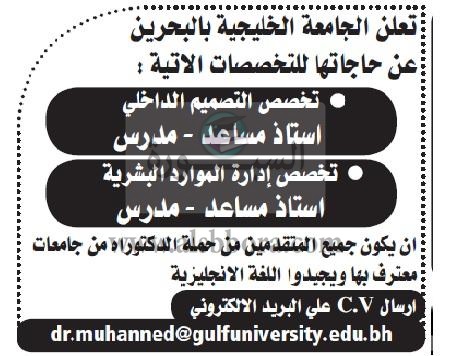 تعلن جامعة بحرينية عن وظائف جديدة لأعضاء هيئة التدريس "من حملة الماجستير والدكتوراه" وذلك وفقا لنص الإعلان التالي:-