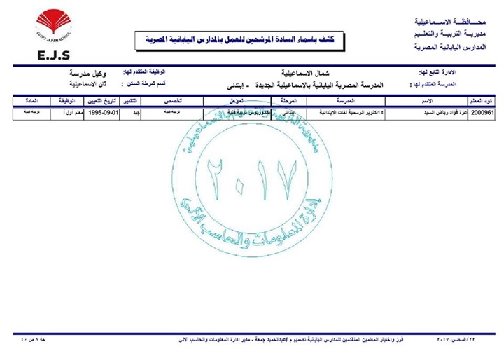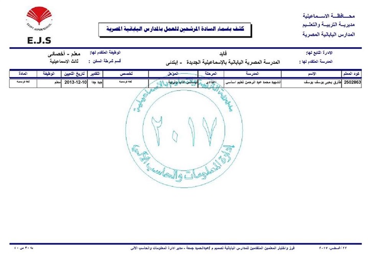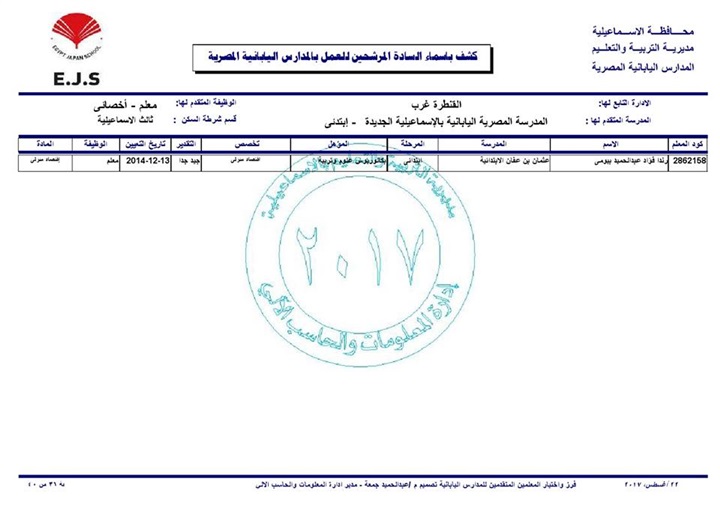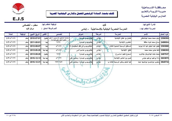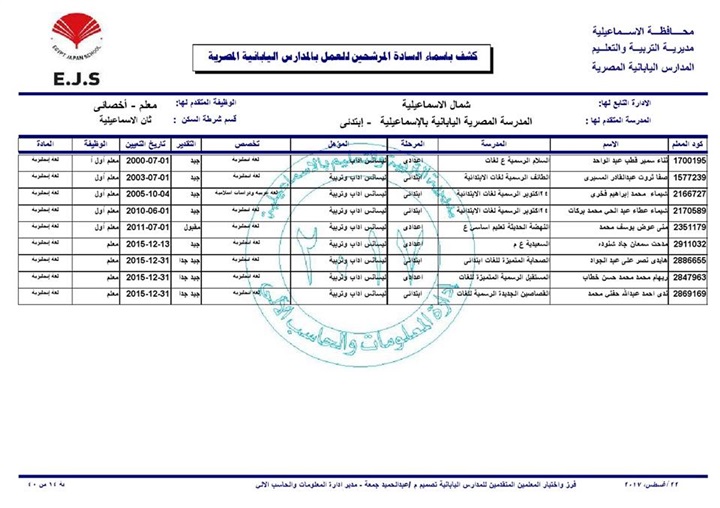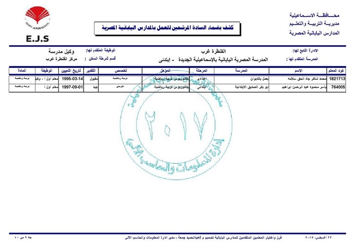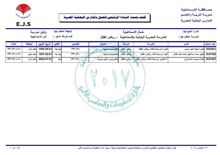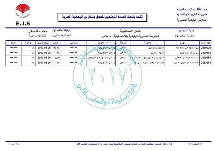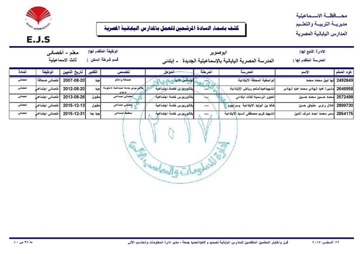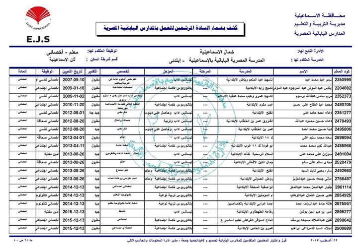 اعلنت مديرية التربية والتعليم بمحافظة الاسماعيلية اسماء السادة المتقدمين للعمل بالمدارس اليابانية المصرية ، على ان يتم بدء استلام ملفات التقديم بدء من الثلاثاء 2017/08/22 بقاعة الاجتماعات بالمديرية على ان يشمل الملف على