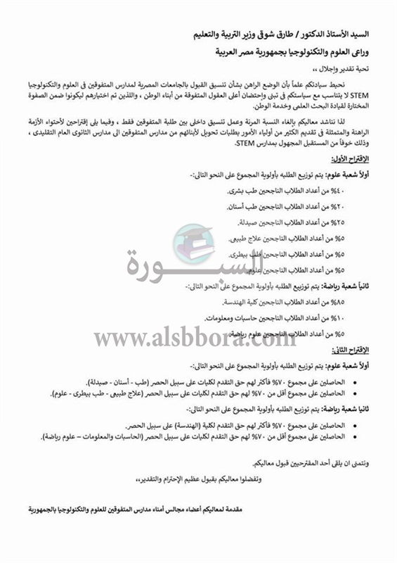 قدم أعضاء مجالس امناء مدارس المتفوقين للعلوم التكنولوجيا على مستوى الجمهورية التماسا الى الدكتور طارق شوقى وزير التربية والتعليم والتعليم الفنى بشأن تنسيق القبول بالجامعات المصرية لمدارس المتفوقين فى العلوم والتكمولوديا والذى لا يتناسب مع احتضان اعلى العقول المتفوقة من ابناء الوطن، وجاء نص الالتماس كالتالى: