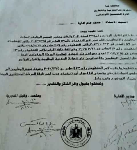 ارسلت مديرية التربية والتعليم بمحافظة قنا امر ادارى لجميع الادارات التعليمية يفيد بعودة جميع المعلمين الى وظائفهم السابقة قبل تغيير المسمى الوظيفى ، حيث وجهوا لكل المعلمين الذين قموا بعمل تغيير مسمى وظيفى الرجوع مرة اخرى للمرحلة الذى كان مسكن عليها ، قبل تغير المسمى الوظيفى .