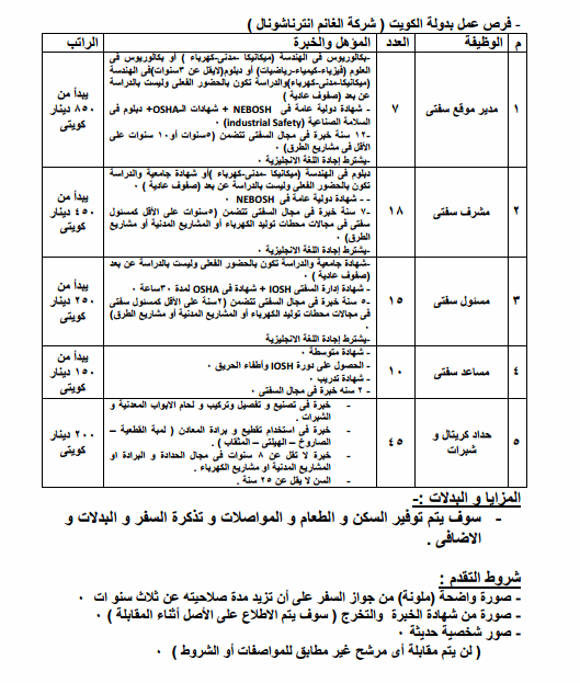 وظائف دولة الكويت " هى وظائف وفرص عمل بشركة الغانم انترناشونال " حيث ان العدد المطلوب هو 425 وظيفة وفرصة عمل حيث تترواح الرواتب حسب كل وظيفة حيث ان احدى هذة الوظائف يبدأ الراتب فيها من 850 دينار كويتى