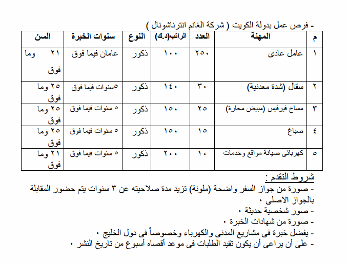 القوى العاملة تعلن عن وظائف بدولة الكويت براتب 850 دينار والامارات براتب 4000 درهم