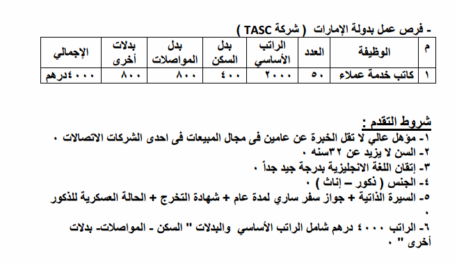 وظائف دولة الامارات " هى وظائف وفرص عمل بشركة TASC " حيث ان عدد الوظائف المطلوبة 50 وظيفة براتب 4000 درهم اماراتى راتب اساسى وبدلات وسكن ومواصلات وبدلات اخرى