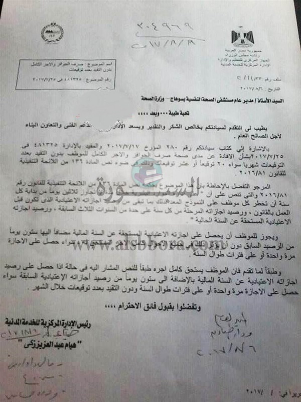 ارسل الجهاز المركزى للتنظيم والادارة الى مدير عام مستشفى الصحة النفسية بمحافظة سوهاج التابعة لوزارة الصحة بأحقية حصول الموظف على اجازاته الاعتيادية دون المساس بالحوافز والأجر الكامل وتدون التقيد بعدد توقيعات سواء كانت 10 أو 20 توقيعا.