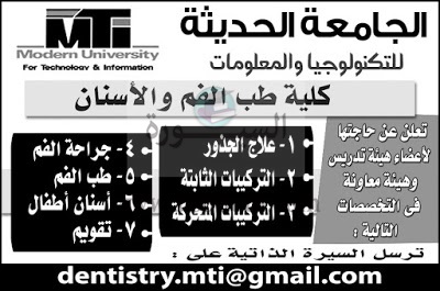 تعلن الجامعة الحديثة للتكنولوجيا تعلن عن حاجتها الى أعضاء هيئة التدريس، وعلى الراغبين فى التقدم ارسال السيرة الذاتية على الايميل المنشور فى اعلان جريدة الأهرام.