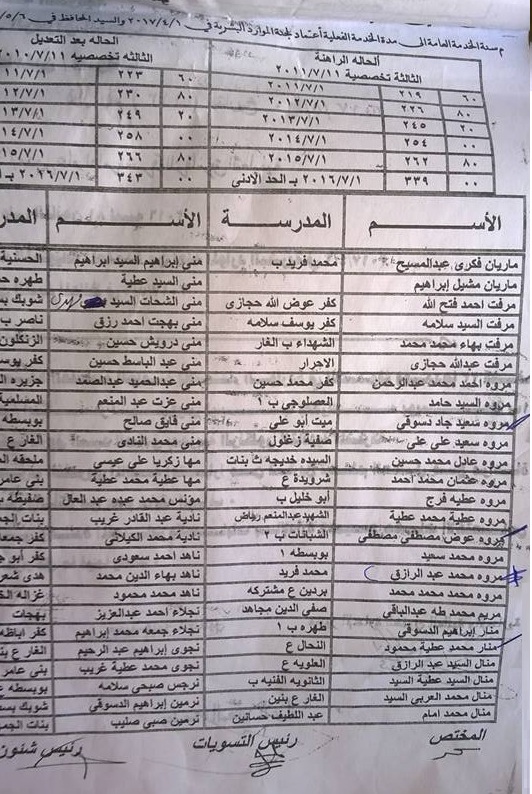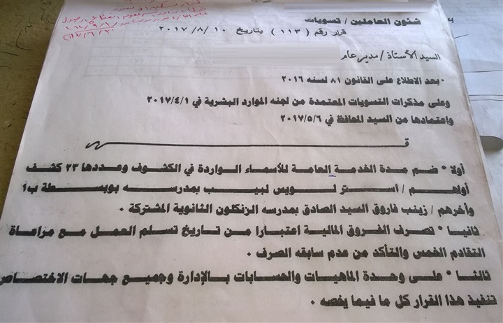 ارسلت ادارة شرق الزقازيق تعليماتها لجميع المدارس الكائنه بها بقرار ضم الخدمة العامة للمعلمين ، وصرف الفروق المالية من تاريخ استلام العمل مع مراعاة التقادم خمس سنوات وجاءت التعليمات كالتالى :