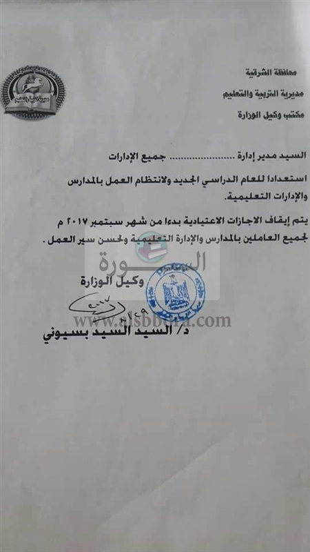 أصدرت مديرية التربية والتعليم بالشرقية، قرار بإيقاف جميع الإجازات الإعتيادية بدءا من شهر سبتمبر لجميع العاملين بالمدارس والإدارات التعليمية لحسن سير العمل.