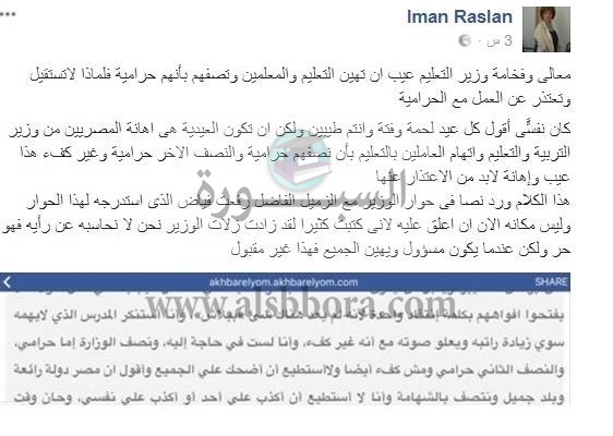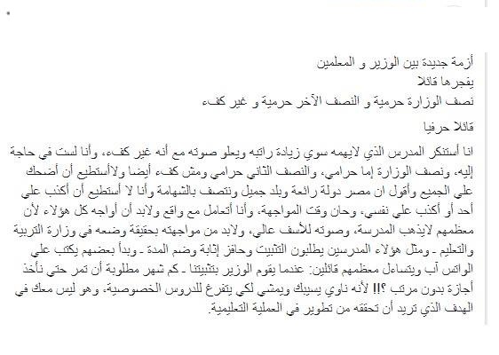 وقالت: "معلمو مصر ليسوا لصوصا أو حرامية كما ادعى الوزير"، وطالبت بالتحقيق مع وزير التعليم فيما نسب إليه من تصريحات، مشيرة إلى أن الوزير دأب على إصدار مجموعة من التصريحات الاستفزازية تجاه المعلمين والعاملين بالوزارة منذ فترة ليست بالقصيرة، وأنه فور توليه بالمسئولية نعت الجميع بالفشل وقالت: "فهل يعني هذا أنه سيأتي بوزارة جديدة أم ماذا؟".