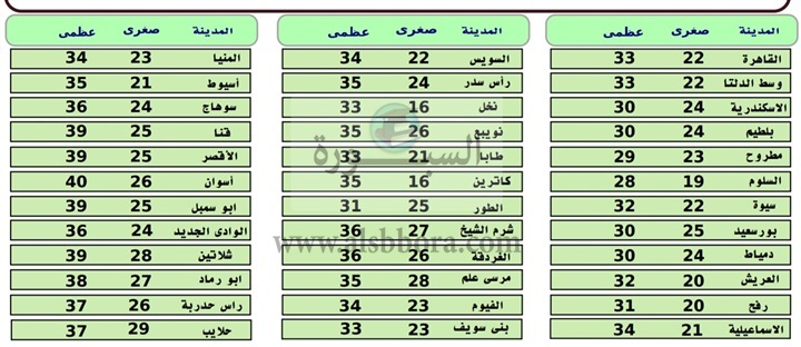 وفيما يلي بيان بدرجات الحرارة المتوقعة اليوم على محافظات ومدن مصر: