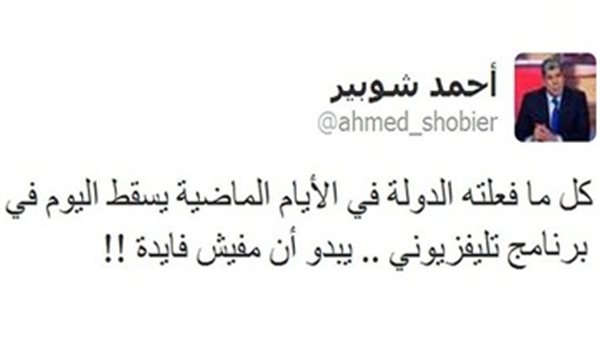 شوبير ..ما فعلتة الدولة في الايام الماضية سقط في برنامج تليفزيوني ت هدي حسني قال الاعلامي أحمد شوبير في تتويتة له علي حسابة الشخصي علي تويتر أن ك السبت 07/سبتمبر/2013 - 01:15 م facebook twitter whats x facebook twitter rss feed , facebook twitter whats