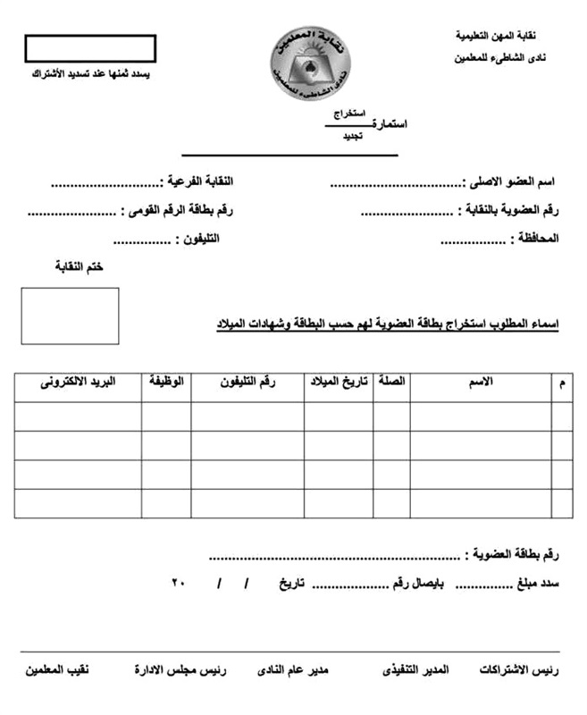 للمعلمين.. اشتراك النادى بـ" 10جنيهات" للعضو واسرته.. ننشر استمارة الاشتراك
