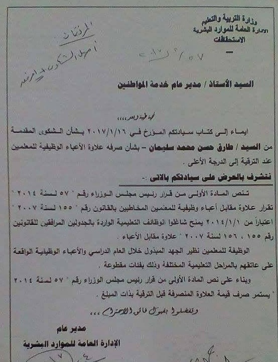 بالمستندات|التعليم:"عدم خصم علاوة الاعباء الوظيفية من المعلمين عند الترقية للدرجة الاعلى "