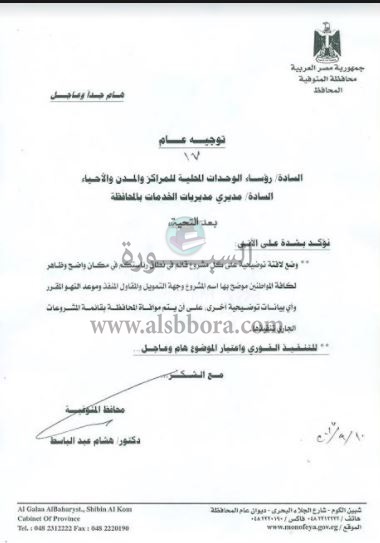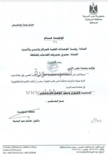 أصدر اليوم الدكتور هشام عبد الباسط محافظ المنوفية توجيه عام رقم (16)،(17) للسادة رؤساء المدن والأحياء ومديري مديريات الخدمات بالمحافظة أكد فيه علي سرعة الرد علي مخاطبات الجهات الحكومية خلال أسبوع بحد أقصي وفي حالة عدم الرد سيتم إعتبارها موافقة علي طلب الجهة علي أن تتخذ الاجراءات القانونية في حالة عدم الرد فورا.