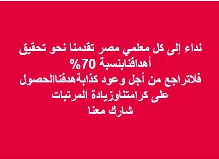 تداول نشطاء التعليم على جروب اتحاد معلمى مصر كوميكس ينادى كل معلمى مصر بانهم تقدموا نحو تحقيق أهدافهم بنسبة 70%.. فلا تراجع من أجل وعود كذابة.. هدفنا الحصول على كرامتنا وزيادة المرتبات.. شارك معنا.