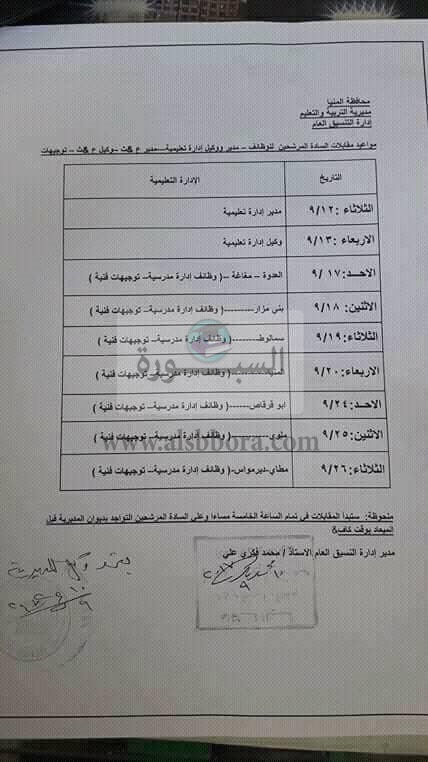 ننشر مواعيد مقابلات المرشحين لوظائف مدير ووكيل ادارة تعليمية
