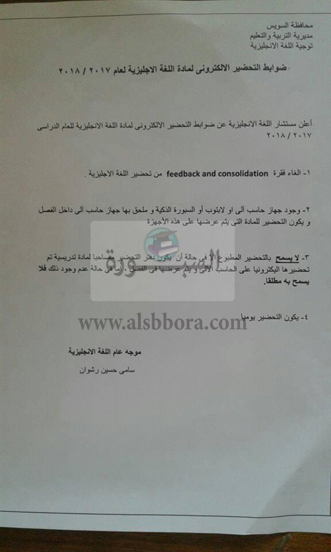 أعلنت مستشار مادة اللغة الانجليزية بمديرية التربية والتعليم عن ضوابد التحضير الالكترونى للعام الدراسى 2018/2017.