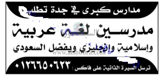 تعلن كبرى المدارس فى المملكة العربية السعودية "جدة" عن حاجتها الى معلمين فى تخصصات "اللغة العربية والتربية الاسلامية واللغة الانجليزية" وعلى الراغبين فى التقدم ارسال السيرة الذاتية عبر الفاكس اسفل الاعلان.
