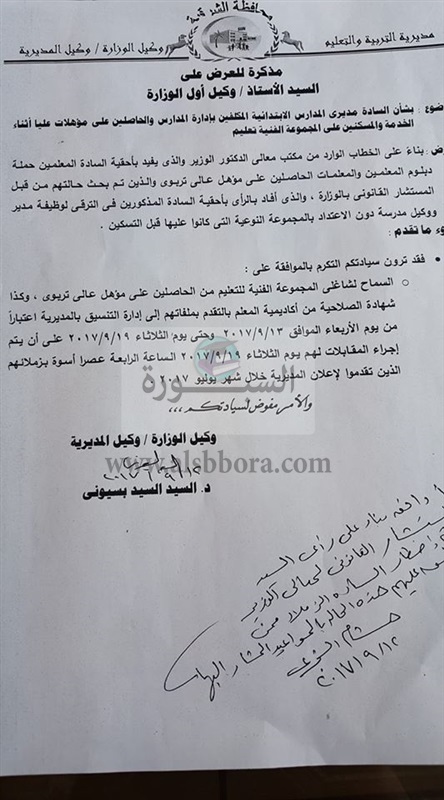 وافق هشام السنجري وكيل أول وزارة التربية والتعليم بمحافظة الشرقية على مقترح الدكتور السيد بسيوني وكيل الوزارة فتح باب التقديم للسادة المعلمين ومديري ووكلاء المدارس من الحاصلين على مؤهل عالي تربوي أثناء الخدمة ولم يتم التسوية به إلى إدارة التنسيق بالمديرية وفق المواعيد المذكورة بالمنشور