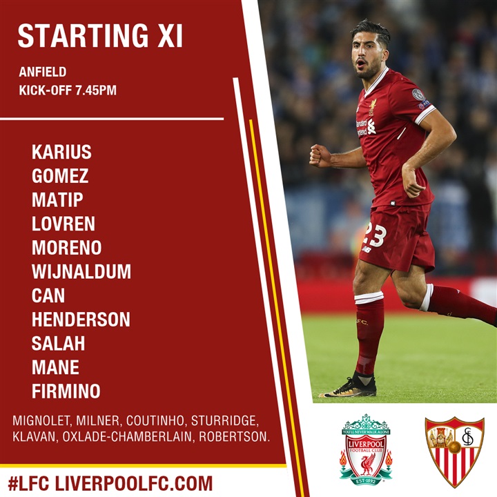 أعلن الألمانى يورجن كلوب، المدير الفنى لفريق ليفربول الإنجليزى، التشكيل الذى يخوض مباراتة أمام إشبيلية الإسبانى، والمقرر إقامتها فى التاسعة إلا ربع مساء اليوم الأربعاء، على ملعب "آنفيلد"، ضمن منافسات الجولة الأولى لدور المجموعات بمسابقة دورى أبطال أوروبا.