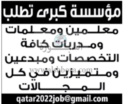 تعلن مدارس خاصة في دولة قطر تعلن عن وظائف جديدة للمعلمين والمعلمات في جميع المواد وذلك وفقا لنص الإعلان التالي:-