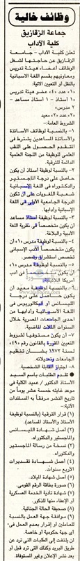 تعلن جامعة الزقازيق عن ظائف جديدة لأعضاء هيئة التدريس "من حملة الماجستير والدكتوراه" وذلك وفقا لنص الإعلان التالي:-