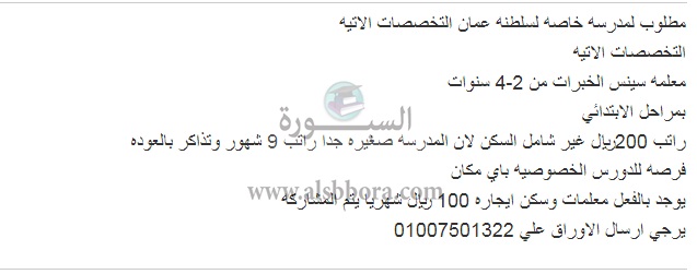 تعلن مدرسة خاصة في سلطنة عمان عن وظائف جديدة للمعلمين والمعلمات وذلك وفقا لنص الإعلان التالي:-