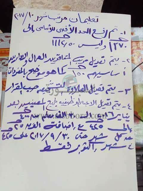 واضاف النشطاء، انه تم رفع الحد الاقصى للاساسي الى 1370 جنيه وليس 1112.50جنيه، يتم تعديل مرتب المتعاقدين العمال والاداريين اساسهم150 جنيه كما هو موضح بالمفردات، يتم تعديل العلاوة التشجيعية حسب القرار ، يتم تعديل الاعباء الوظيفية لجميع المعينين بعد يناير 2016 الـ30الف معلم من 400جنيه الى 425جنيه مع مع اضافة الفرق 25 جنيه على كل شهر حتى 30 سبتمبر 2017 على 425 جنيه في شهر اكتوبرفقط.