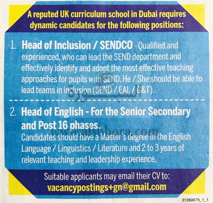 تعلن احدى المدارس الرائدة في دبي بدولة الإمارات العربية المتحدة، والتى تتبع المنهاج البريطاني عن حاجتها الى معلمين، وعلى الراغبين فى التقدم ارسال السيرة الذاتية عبر الايميل المنشور فى الاعلان التالى: