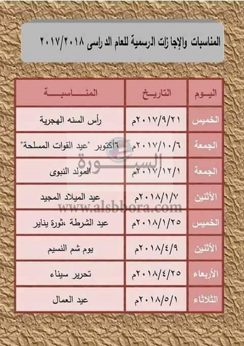 ننشر جميع الاجازات الرسمية والمناسبات للمعلمين للعام الدراسى 2018/2017