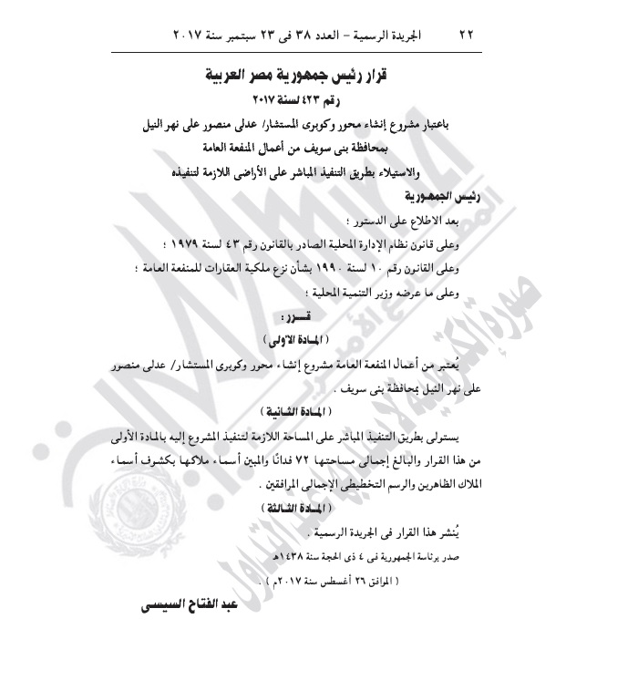 أصدر الرئيس عبد الفتاح السيسى، قرارا جمهوريا برقم 423 لسنة 2017، باعتبار مشروع إنشاء محور وكوبرى المستشار عدلى منصور على نهر النيل بمحافظة بنى سويف، من أعمال المنفعة العامة، والاستيلاء بطريق التنفيذ المباشر على الأراضى اللازمة لتنفيذه.