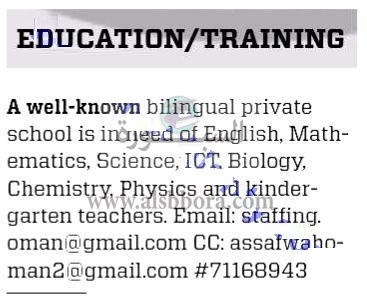 تعلن مدرسة خاصة في سلطنة عمان عن وظائف جديدة للمعلمين والمعلمات وذلك وفقا لنص الإعلان التالي:-
