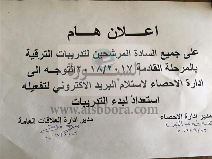 نبهت هبة طه عبدالنبي، مديرة ادارة الاحصاء، جميع المعلمين المرشحين الترقية بالمرحلة القادمة 2017\2018 التوجه لادارة الاحصاء لااستلام البريد الاكترونى لتفعيلة استعدادا لبدء التدريبات.