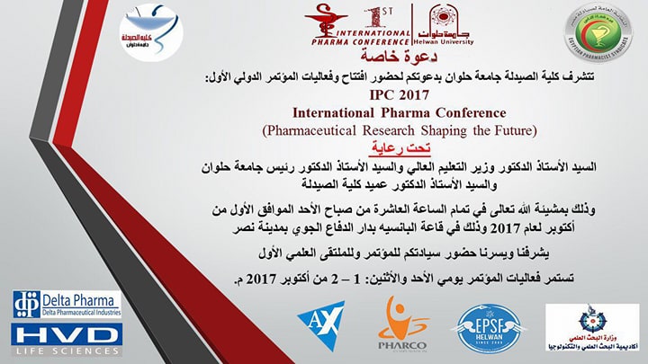 تفتتح كلية الصيدلة جامعة حلوان المؤتمر الدولي الأول( Ipc ) 1 أكتوبر المقبل، وذلك بحضور الدكتور خالد عبد الغفار وزير التعليم العالي والبحث العلمى، والدكتور ماجد نجم رئيس الجامعة و الدكتورة وداد سكران عميد الكلية، وذلك في تمام الساعة العاشرة من صباح الاحد الموافق الاول من اكتوبر، بقاعة البانسية بدار الدفاع الجوى بمدينة نصر.