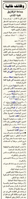 تعلن جامعة الزقازيق عن وظائف جديدة لأعضاء هيئة التدريس"من حملة الماجستيروالدكتوراه" علما بأن أخر موعد للتقديم 3 أكتوبر المقبل وذلك وفقا لنص الإعلان التالي:-